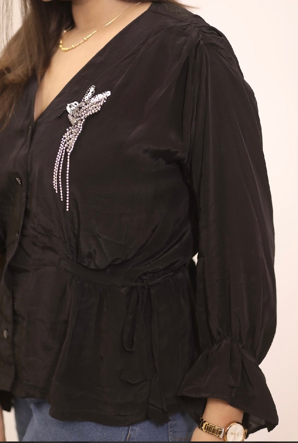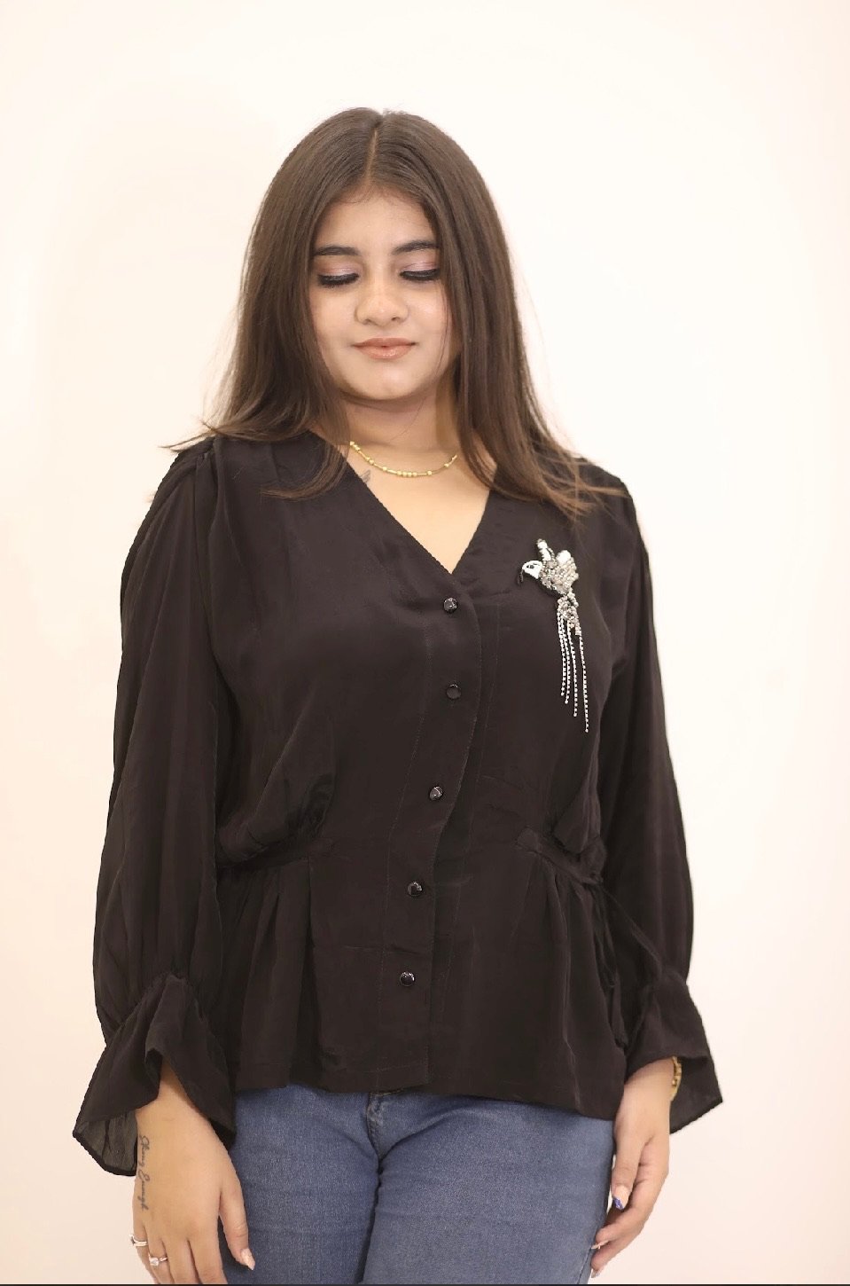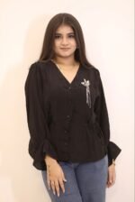 Birdie Black is your perfect mix of cute and chic. Crafted from soft crepe fabric, this black peplum top features a graceful bird patch that adds a playful spark, while the flattering silhouette lets you dress it up or down effortlessly. The dori at the waist gives you the freedom to style it loose or fitted, just the way you like. Its pretty sleeves and shirt-style front buttons add just the right dose of charm.